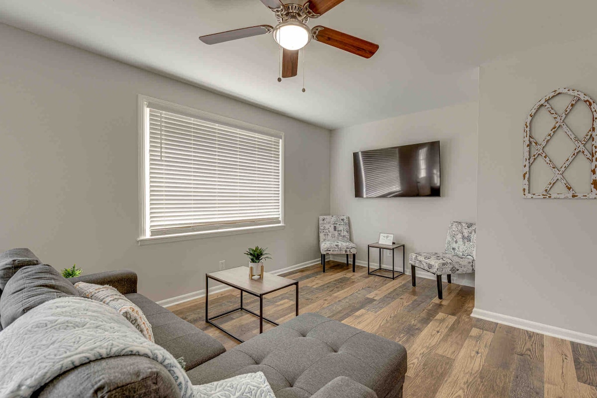 The Bungalow is one of the two lower apartments in a 1930’s renovated triplex highlighting historic charm with modern conveniences in the darling Riverside neighborhood in Columbia TN. Decorated in a modern farmhouse style to showcase the feel of the space, it is classy-shabby chic. The Bungalow is the only space in Riverside Retreat with a private covered porch! This railroad style apartment is a small, clean, cozy space with everything you need for an amazing stay in historic Columbia.