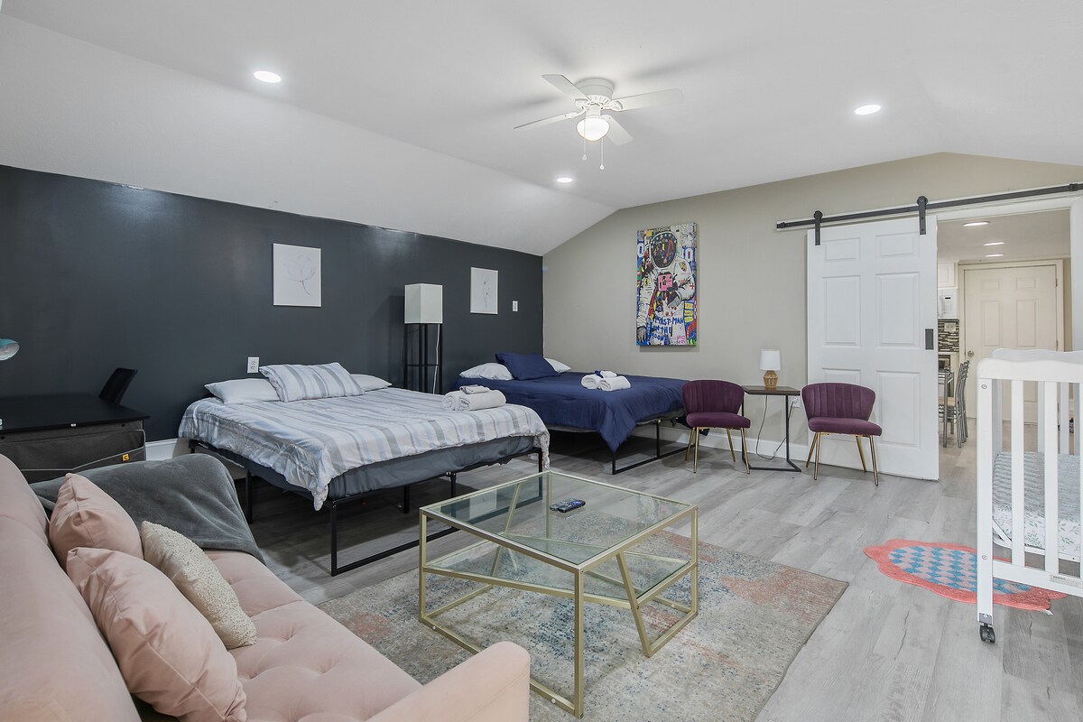 Perfect for family visits or small groups, this private Fayetteville suite comfortably accommodates up to three guests. Enjoy a 65-inch TV in the living room and a 55-inch TV in the bedroom, both with Netflix, Disney+, Premier, and Jellyfin. The bedroom features a king-size bed for two adults and an infant, while the living room has a queen sleeper sofa for one adult or two children. With a fully equipped kitchen, workspace, bathroom, laundry room, and enclosed yard, it’s perfect for any stay.