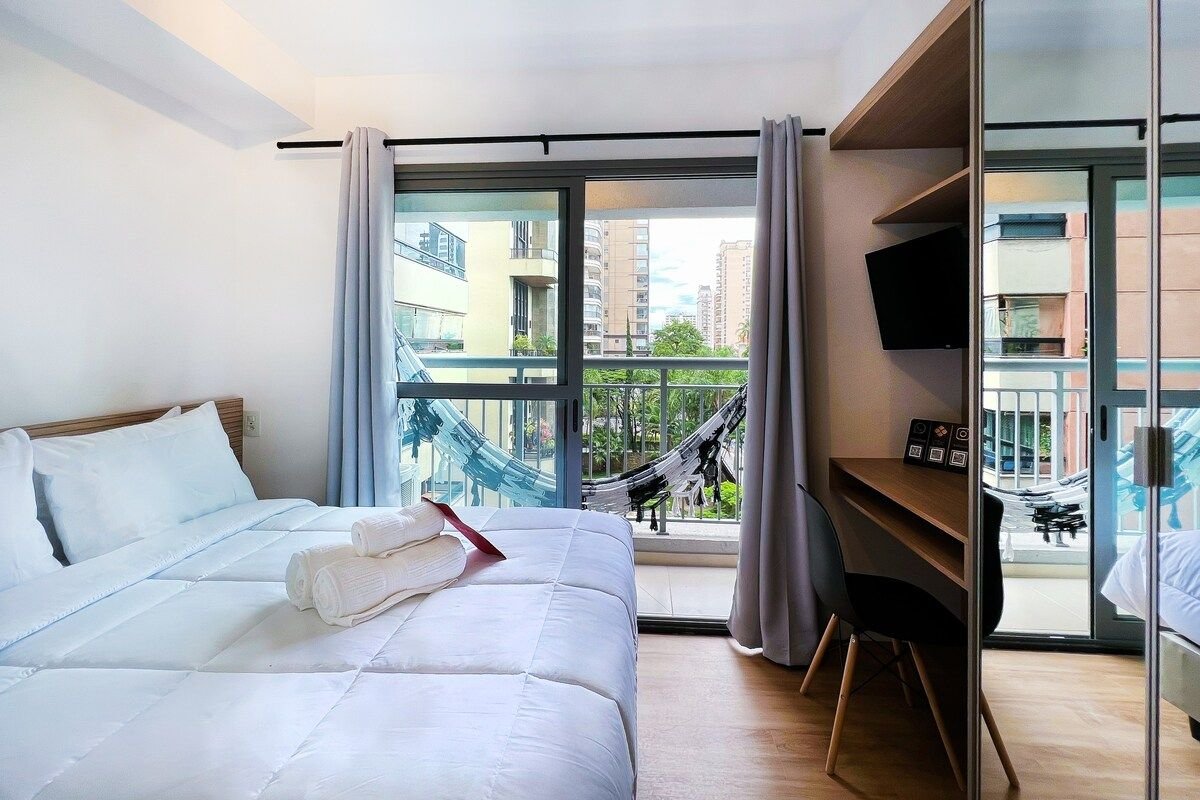 Studio sofisticado e moderno, na melhor localização do Itaim Bibi, em condomínio de luxo novíssimo e moderno próximo ao Parque Ibirapuera e Avenida Faria Lima. Ambiente projetado para ser sua casa em São Paulo. Os Hospedes tem acessos às áreas comuns do condomínio. - Lavanderia, piscina, academia completa, salão de jogos, share space com lounge, sala de reunião, share working, espaço de lazer e recepção 24 horas. - Ar condicionado split - wifi 300 mbps - cozinha completa - cama mesa e banho