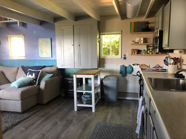 Our thoughtfully equipped waterfront mini guesthouse is just steps away from our beachfront on the Guemes Island. Located on the scenic western shore of the island, you can enjoy extraordinary sunsets, panoramic island views, miles of beach combing, and abundant wildlife. Our mini guesthouse, "The Seldom Inn" measuring 12 ft. x 14 ft. in size, is approximately 150 feet from our private beach and is located behind our main home.