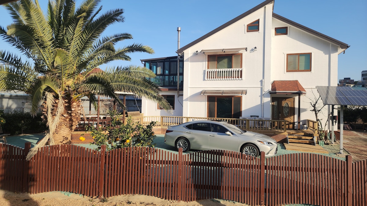 The 'Lee Jung's' in 'Lee Jung's House' It is the respect of my grandmother who raised the owner. I was born in Jeju and lived all my life. After watching for a long time, I opened a dessert shop and stay in this quiet village where the beauty and tranquility of Jeju coexist. You can see the far sea in front of the accommodation, In the back, there is Gun Mountain, the only and largest oreum in Jeju. Guests staying at the property will receive one complimentary drink (limited to two people) per day at Lee Jung's house, and you can use the spacious lawn alone, and if you bring a laptop or USB, you can watch videos with a beam projector indoors and outdoors. How about taking a stroll around the neighborhood on a bicycle? There is a port and a beach nearby, and the sunrise and sunset there are also wonderful views. There is also Yerae Ecological Park, so take a leisurely walk and enjoy the beauty that changes with the seasons. The bus stop is close, making it convenient to use public transportation, and the supermarket (4-5 minutes on foot) is also close. You'll definitely feel it. The charm of this village that I have watched for a long time!