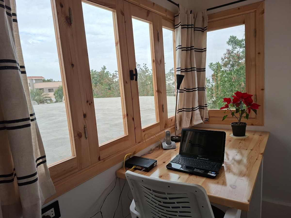 This cozy apartment is located in Eel Garden area 1mins walk to the beach A beautiful bedroom with air conditioning & big window looking over the garden and the palms living room space with sofa & Fully equipped kitchen colorful and modern bathroom huge comfy shared garden full of palms and tree, sea view roof top to enjoy and relax during the day or in the evening to watch the stars, close to everything you will need in dahab yet its very quiet area offering all my guest relaxing holiday.