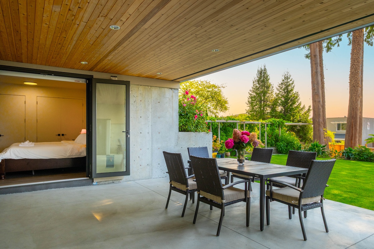 This private, open plan suite was created from my former yoga studio within our family home, reusing and repurposing materials wherever possible. Warm reclaimed hardwood floors leads to a deck at the edge of the Princess Park forest, with a salmon creek running to the west. Wildlife often passes through — raccoons, owls, and occasionally even a bear. Some of the North Shore’s best mountain biking is just a block away. A quiet, unique retreat designed for rest, privacy, and nature.