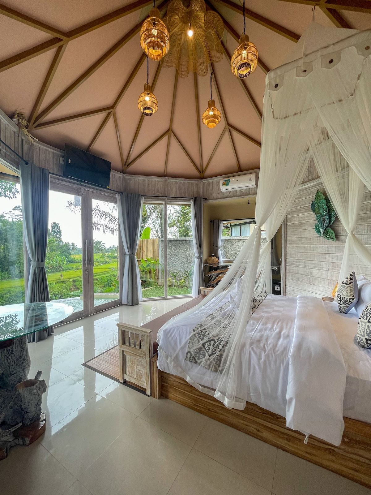 Experience luxe living in our Balinese tree house, nestled amidst the verdant countryside. This luxury cabin, resembling a tiny home, boasts an impeccable design that seamlessly blends with nature. Wake up to an amazing view of majestic mountains, right from your bed. Relax in the unique outdoor bathtub, surrounded by the serene whispers of the jungle. Feast on delightful BBQs on the private deck, set against a panoramic backdrop. Dive into the essence of Bali – where luxury meets the wild.