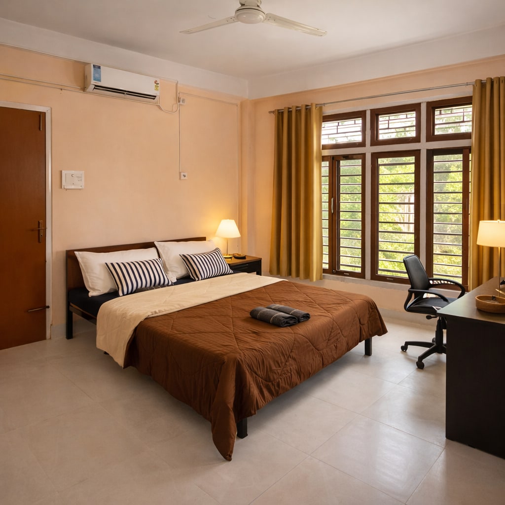 Indulge in the elegance of our 3BHK luxury apartment offering a perfect blend of comfort and sophistication. Two king-sized beds and one queen. Fully air-conditioned The spacious living room transforms into a home cinema with a high-quality projector and screen. Fully equipped kitchen, two designer bathrooms, and two balconies with breathtaking city views to complete the experience. Whether you're in town to relax, work remotely, or enjoy a cozy movie night this is the space designed for all.