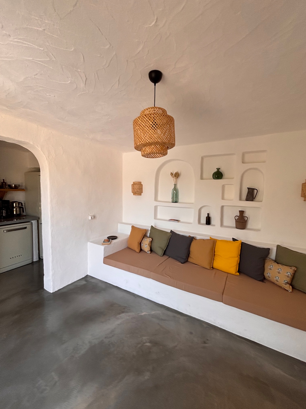 Hi, first of all these are cob houses all made by clay in the traditional stone masonery methods of ancient mediterranean. We're leading a self sustainable life 'as much as we can' so our electricity is coming from solar energy panels which are enough to run a small fridge, laptops, lights and phone charges. Wood fire water heater in the bathroom. We wanted to be far from the crowd so we re a bit not so easy to get at. So its best if you have a 4x4 or u can walk a path uphill for 15 minutes.