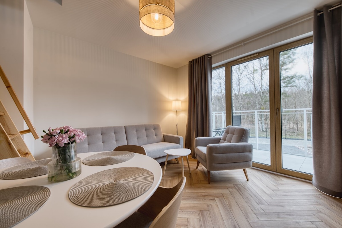 The tranquility of coastal nature, away from stalls, noisy promenades and crowds. A cozy apartment, close to the sea and the forest, is a real oasis of tranquility. A forest path among pines and beeches leads to a wide, sandy beach with a captivating cliff — a perfect place to relax, magical walks and sunsets. A comfortable living room, bedroom and full kitchen will make you feel at home. Here nature plays the first violin — forests, Lake Gardno and Słowiński National Park await.