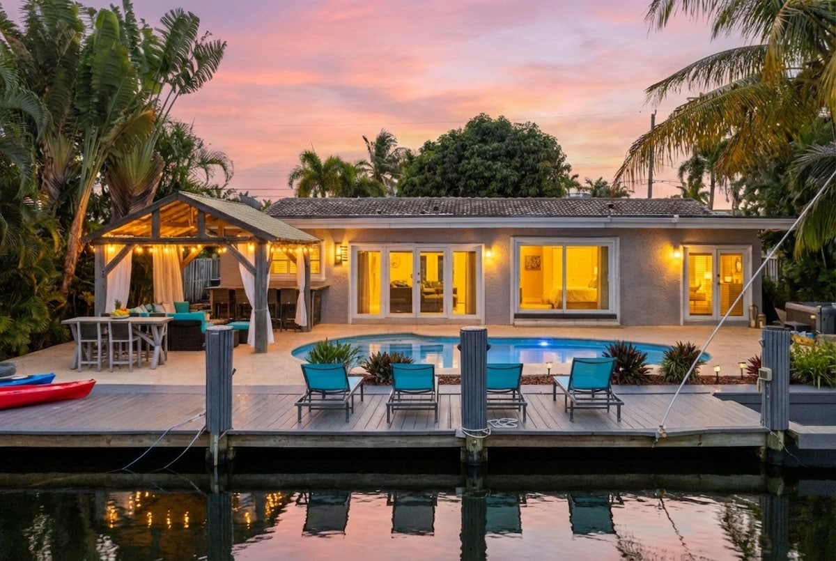 WATERFRONT HOME W/ HEATED POOL & FOUNTAIN, TIKI HUT W/BAR, KAYAKS & BIKES! DIRECT TO INTRACOASTAL W/LUXURY FINISHES & BEAUTIFULLY FURNISHED IN THE HEART OF POMPANO BEACH. THIS HOME INCLUDES 3 BEDROOMS & 2 BATHROOMS & A HEATED POOL! CLOSE TO BEACH, WATERSPORT ACTIVITIES, FINE DINING & UPSCALE SHOPPING. YOUR IDEAL FLORIDA BACKYARD GREAT TO GRILL & RELAX ON LOUNGE CHAIRS WHILE OVERLOOKING THE WATER. 2 KAYAKS INCLUDED!