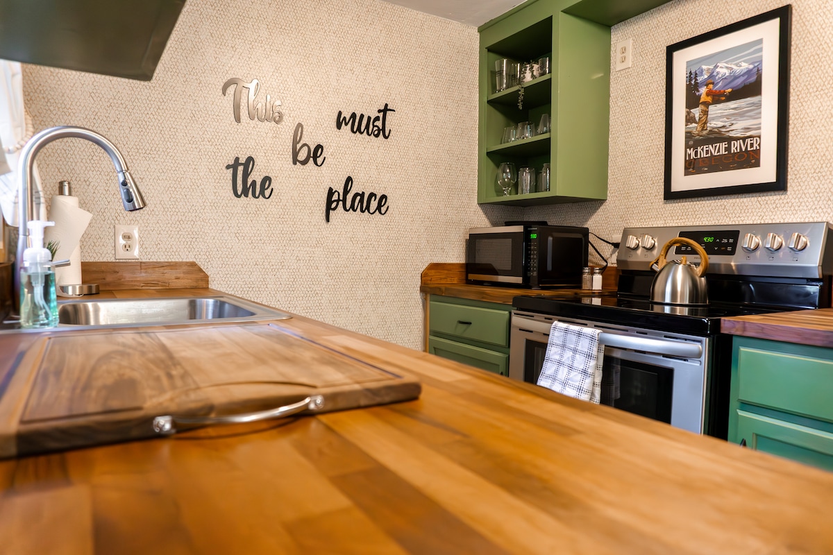 Take it easy at this unique and tranquil getaway. Step out through the glass doors, to experience the wonder of the McKenzie River. Walk and lounge on the grassy lawn, step down to the river's edge, cast in if you care. Experience tranquility as the white water rushes over Clover Point. Or stay in and cozy with a fully stocked kitchen, smart TV and Wi-Fi. At the end of your adventure filled day, let the tumbling river lull you to sleep. The area abounds with outdoor adventures and scenic sights