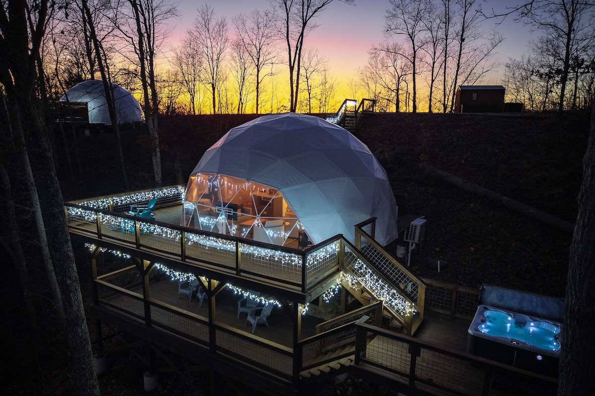 Nature meets luxury in this unique glamping dome experience. Enjoy the privacy of a peaceful, secluded setting, complete with everything you need for a one-of-a-kind getaway. Heating and A/C, full bathroom, Luxury Saatva mattresses & bedding. Functional kitchenette, and private outdoor living space with private hot tub and natural gas fire pit. Booked for your desired dates?! Check out our Highland Views Dome! Same amenities, same property! https://www.airbnb.com/h/ygahighlandview