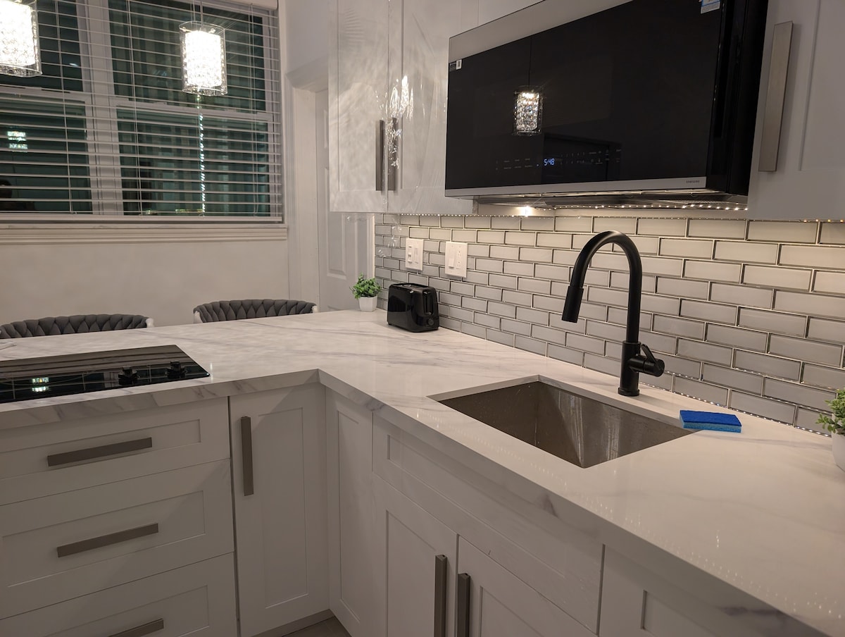 Experience deluxe comfort and modern style just a 10 minute drive to the beach. You'll love the unique custom kitchen countertop and 2 cozy beds. We've thought of everything to make your stay comfortable, 65" 4K smart TV, washer/dryer, 2 dedicated parking spots, a private patio, and a fully equipped kitchen. There's a dedicated work desk and high speed internet. Hydro-jet shower system and lit mirror in the bathroom, color-changing mood setting mirror, impact windows, central AC, noon checkout.