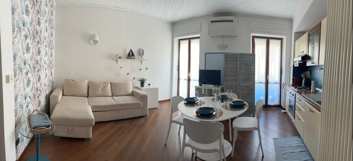 Bright 150-square-meter apartment just a short walk from the lakeside promenade, 500 meters from the center: living room, dining room, balcony with seating area and outdoor dining nook, 3 double bedrooms (2 with air conditioning), 2 bathrooms with windows and showers. Eat-in kitchen with coffee maker, microwave, dishwasher, oven, refrigerator, freezer, utensils, satellite TV, free Wi-Fi, washing machine, iron and ironing board, and hairdryer. In front of the apartment, free parking, Self check-in on request