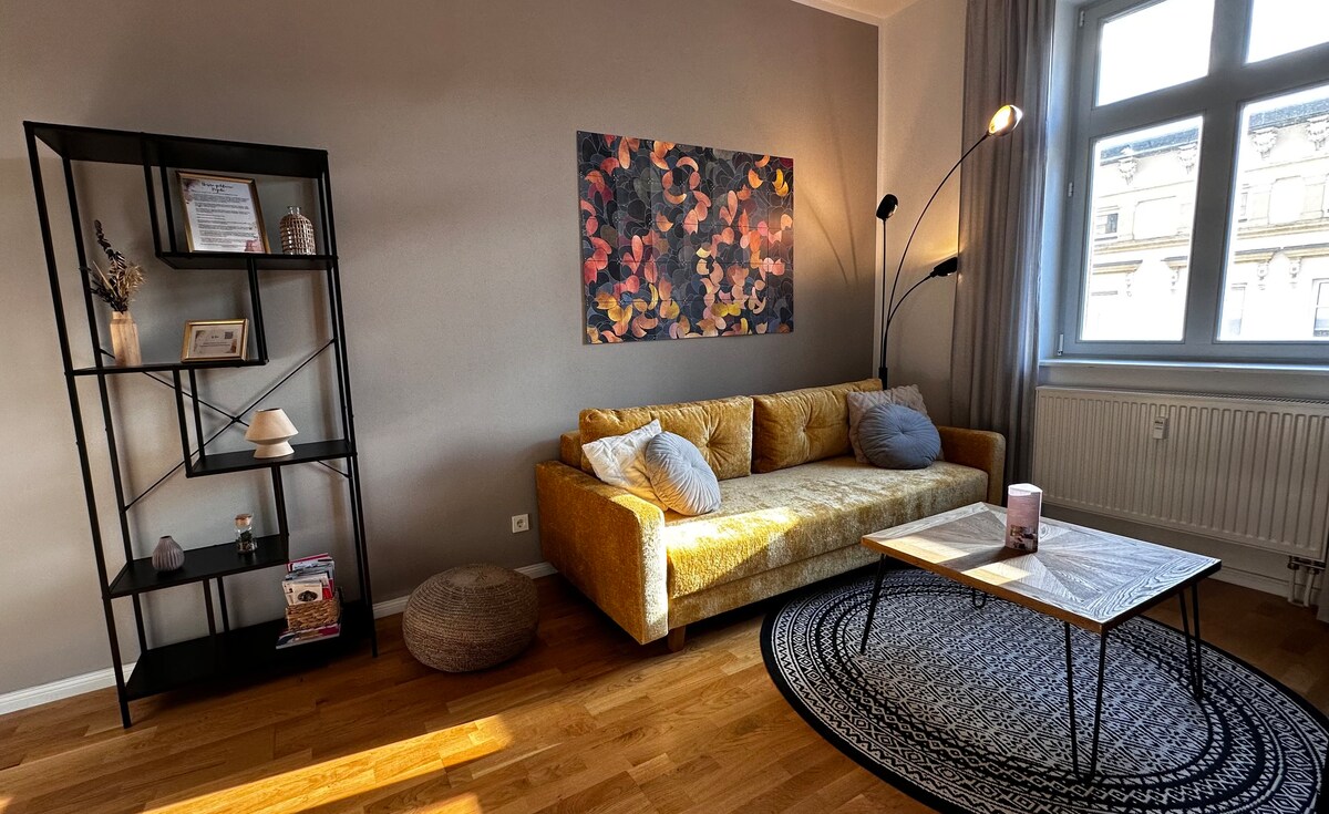 About 1000 meters and you are at Augustusplatz: it does not get much more central! The 2-room apartment is located on the 2nd floor of an apartment building in a side street (quiet) in the Graphisches Viertel. It has a new kitchen, a new bathroom with bathtub, a bedroom with king-size bed, a spacious living room with sofa bed, a parking space in the underground garage & elevator, completely darkenable shutters & a covered balcony facing west, which invites you to relax especially on sunny days.