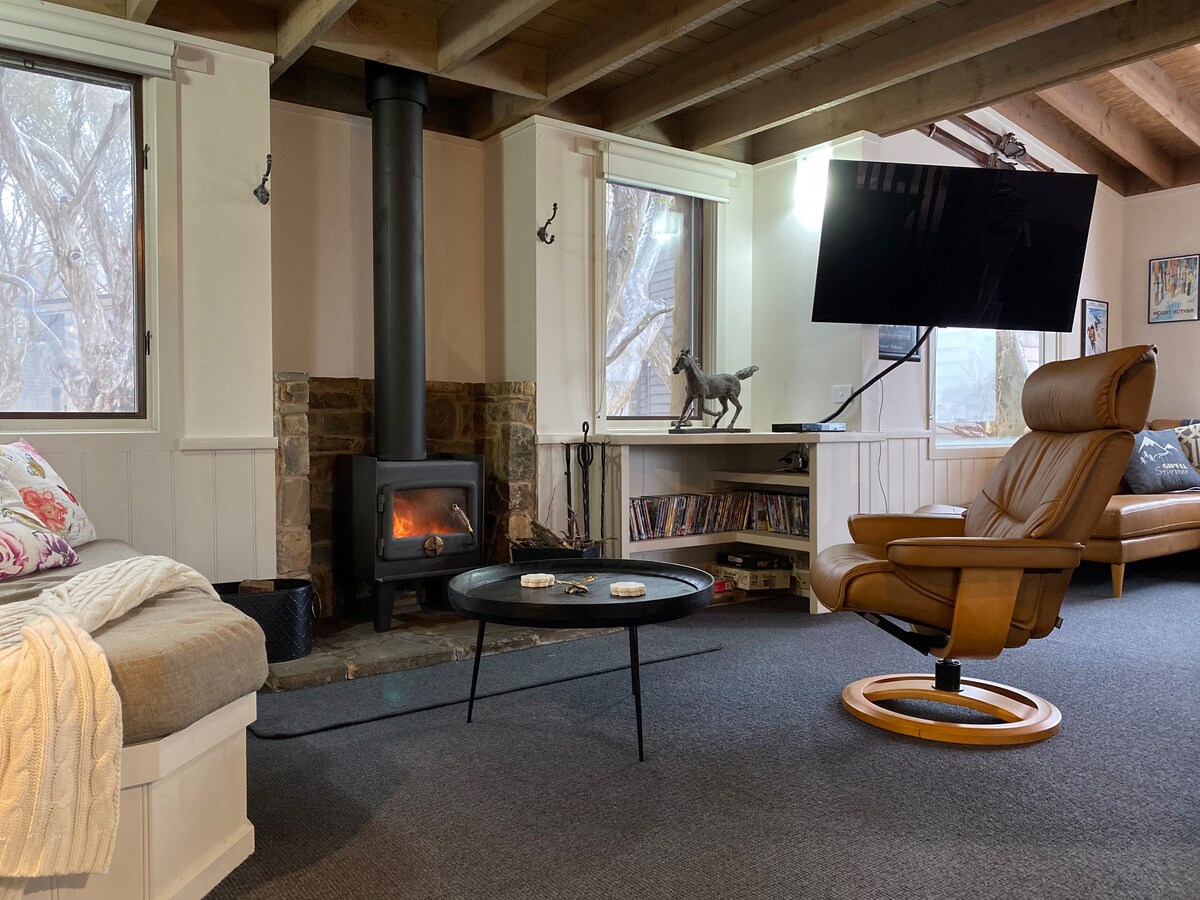 Cabaña Gris - cosy convenience! 5-min walk from pubs, cafes, and 200 meters from the bus stop to Hotham. Upstairs, discover a queen bed, bathroom, and a void offering views of the living space below. You'll find another luxurious queen bed hidden on the wall downstairs in the living room. There's electric heating in the entry/ mudroom to dry all your gear, another in the living and one upstairs. BYO fire wood to get the wood heater cranking. Separate Laundry with second toilet. 2 car parks.
