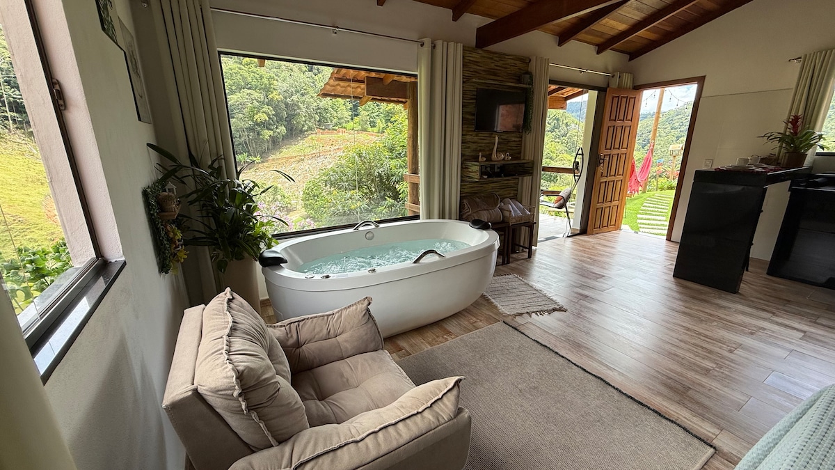 Away Cabanas- in PEDRA AZUL, 5 min from Rota do Lagarto. It has an exclusive automatic door that opens by remote control. Easy access (good road), reliable and fast Wi-Fi, view and PRIVACY! Deck with a hammock perfect for relaxing. Full kitchen, queen-size bed, bed linen and towels included. Air conditioning with HEAT function available. Decoration inspired by the city of Chamonix in France. SAME ROAD AS THE AROSO HOTEL. 2 km from the supermarket, breweries and Pedra Azul.