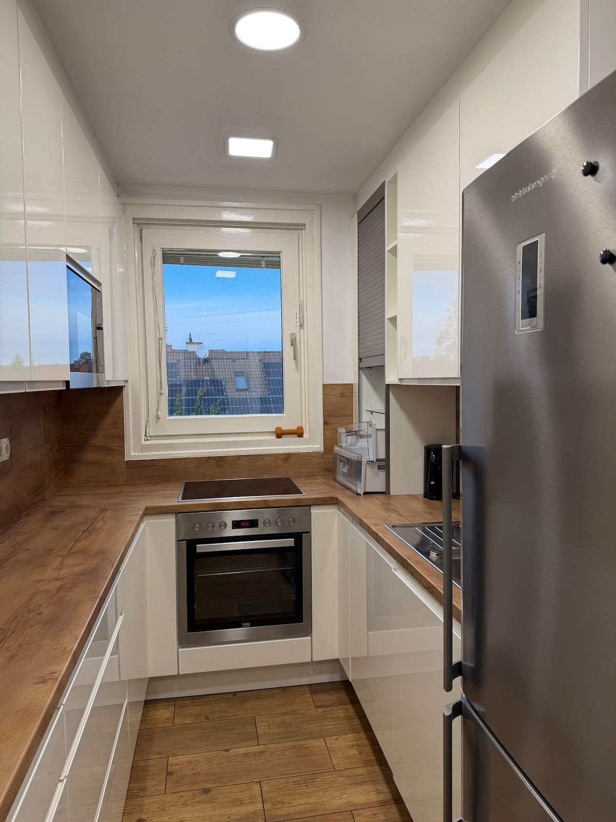 This well-lighted apartment (75 m2) is waterfront by the Danube close to center and consists of an entrance hall, kitchen, living room with dining area, bathroom w/washing machine and bathtub, separate WC, master bedroom and additional bedroom with work desk, and a balcony that is accessible from every room. There is an electic barbecue and comfy furniture on the balcony for beautiful summer evenings, with partial mountain sunset view, and the living room has a projector for cozy video nights.
