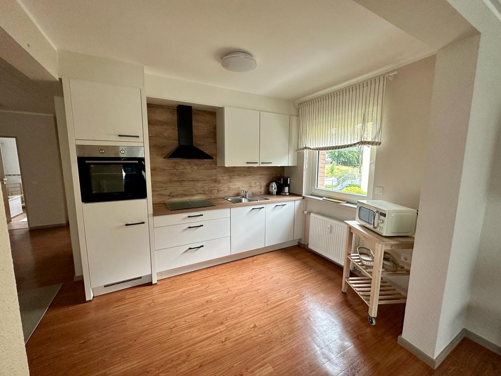 Enjoy the tranquility and the beautiful surroundings in our apartment. Large 3-room apartment with private bathroom and separate entrance. Facilities: satellite TV, free Wi-Fi, parking right outside the front door, fully equipped kitchen with coffee machine, kettle, toaster, dishes and cutlery. A dishwasher including dishwasher tabs are provided. The bathroom has a shower as well as a bathtub. Linen package (linens, towels, kitchen towels) can be booked for €20
