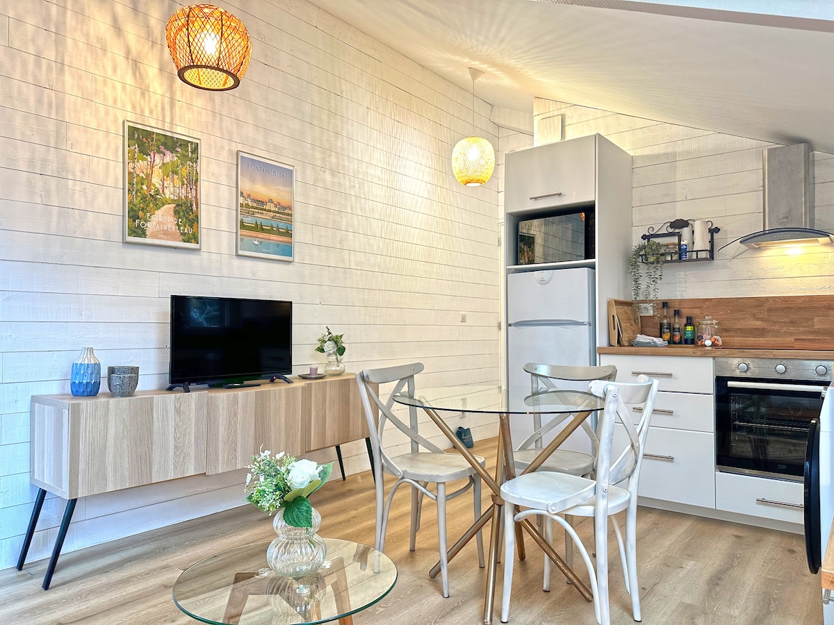 Charming independent studio with fireplace, completely renovated, overlooking a beautiful common courtyard. Located between the hiking trails of the Fontainebleau Forest and the Loing. Quality cleaning is provided by us (included in the price). For your information, we have replaced the sofa bed (daily sleeping) to offer more comfort to visitors. Bike rental (including electric) possible at our neighbor's (instructions on the last photo of the listing).