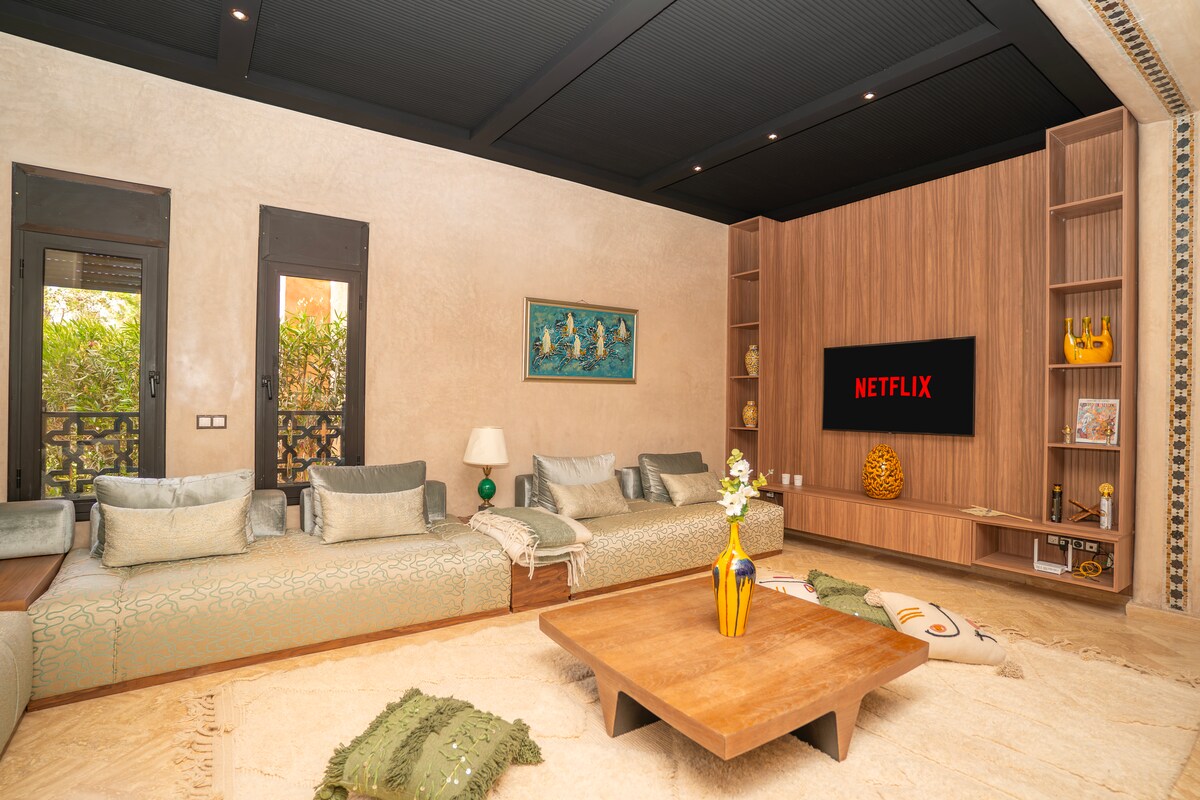 Very comfortable villa, located 30 minutes from Gueliz in a charming 24/7 secure domain with common tennis court. The villa consists of 3 suites each with their fireplace, TV (free access to Netflix), 3 bathrooms, a small heated indoor pool, an outdoor pool, an intimate garden not overlooked, a living room with fireplace and dining table convertible into a pool table and ping-pong table. Ideal for relaxing in peace near the city.