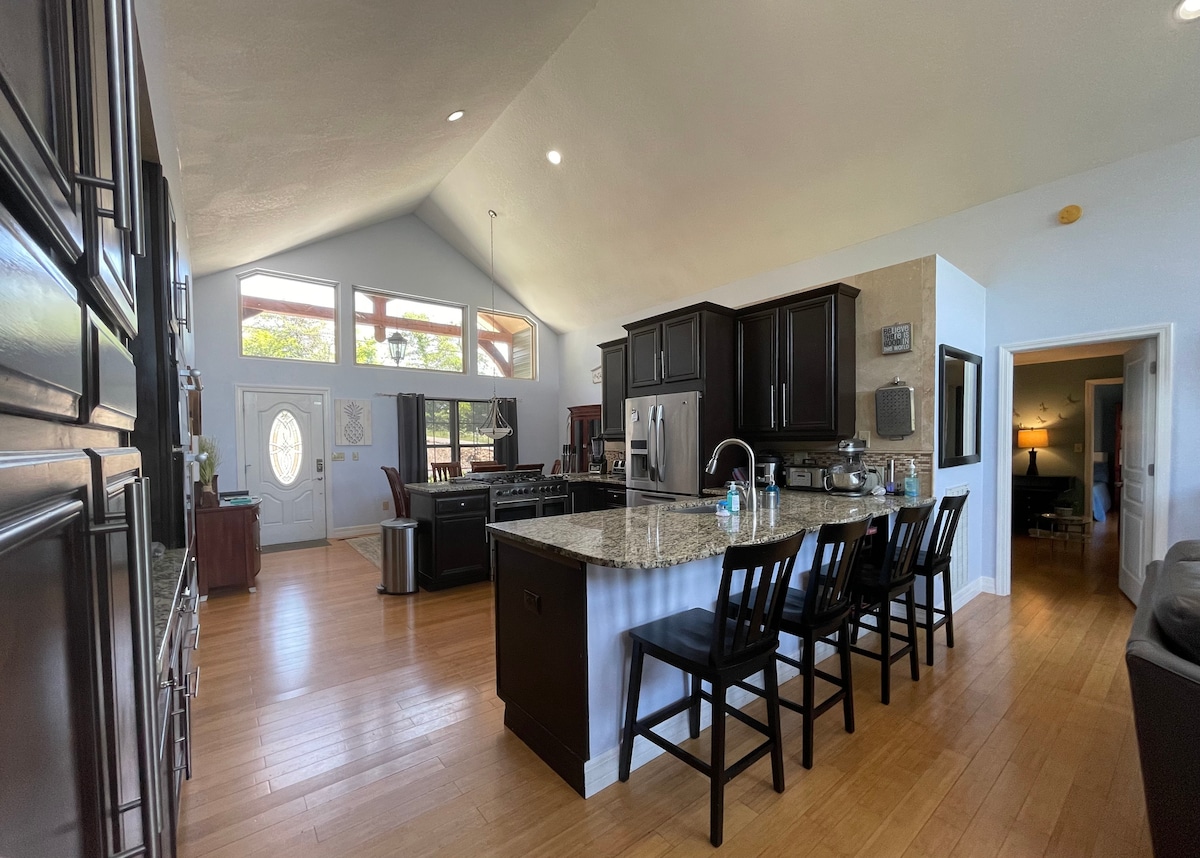 The entire upper level of this luxurious lakefront home is designed for your use and enjoyment. The views of the Smoky Mountains are the backdrop to this oasis. Enjoy a bird’s eye view of lake from the upper deck. Easy access to lake using staircase or paved roadway. Bring all your water toys and dock your boat or swim in the cove using our pontoon as point of access to lake. Gourmet kitchen and large outdoor flat top grill make cooking fun. Many small appliances available for guest use.