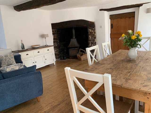 Characterful three storey cottage forming the end part of our 300 year old Devon cob Farmhouse. The cottage features a modern kitchen, huge Inglenook fireplace with log burner, luxurious wool carpets, low beams, big squashy sofa and a superking size master bed with pretty adjoining twin room on the very top floor. The cottage's own garden has two decked seating areas. Set in glorious rolling countryside near Dartmoor, Devon's gorgeous sandy beaches and the vibrant cathedral city of Exeter.