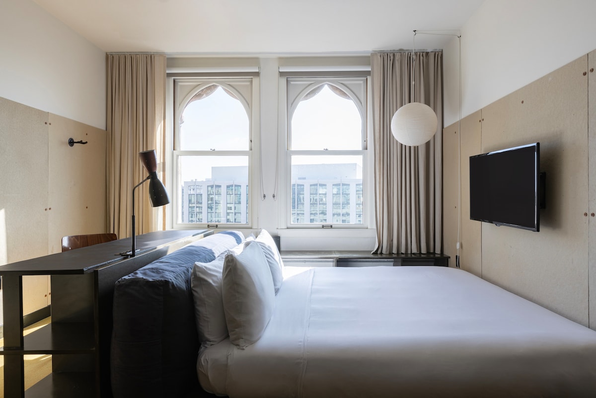 A spacious corner room that gives studio apartment vibes, with curated shelves and exposed brick walls. A king bed, velvet seating, wooden desk and vintage kilim rug help you feel at home – plus three windows that bring in the sunshine. The roomy bathroom is a dream, and ADA friendly. Noise level: Medium Location: First floor View: Gold-Diggers Sound (recording studio)
