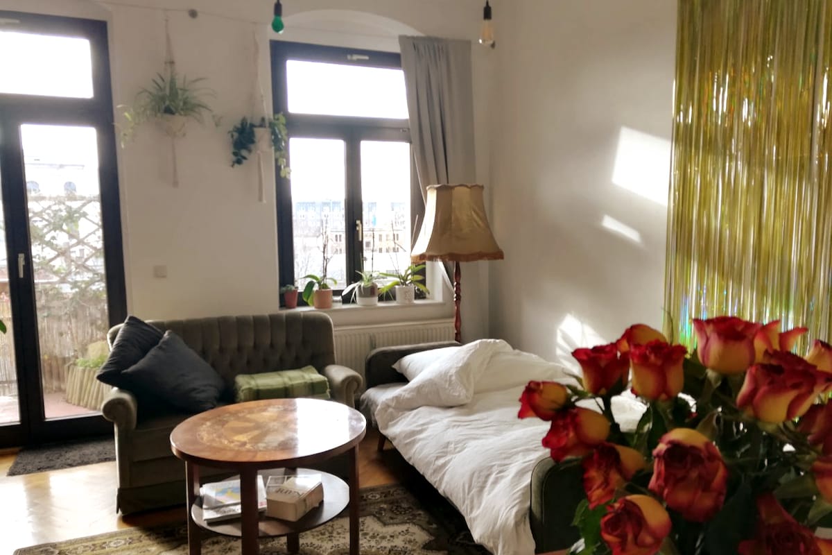 This is our very centrally located, small quiet 2-room apartment with balcony in Dresden Neustadt. It consists of a living room with kitchenette, TV and sofa bed and of course a bedroom with double bed. The bathroom is equipped with a shower. Supermarkets, cafes, bars, restaurants & public transport are in the immediate vicinity. Linens & towels are provided for all of our guests.
