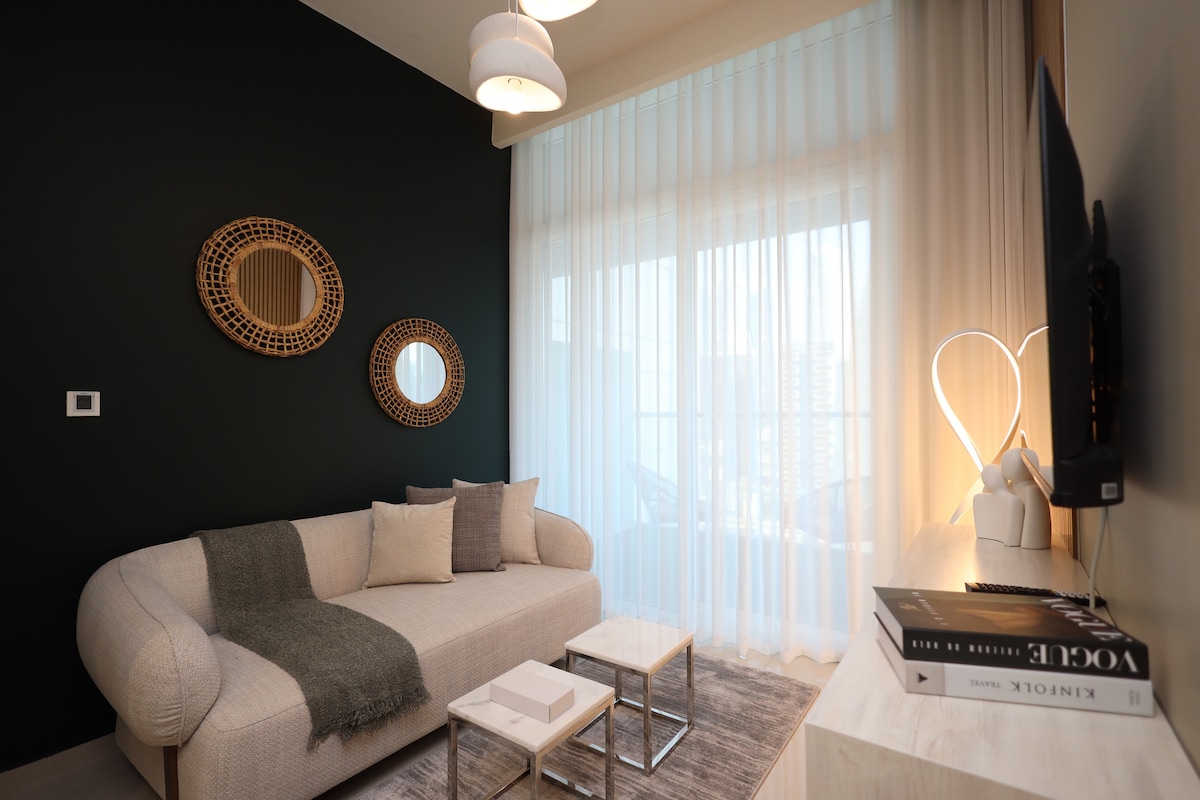 Modern cozy apartment with one bedroom living room and kitchen. The windows have a pleasant view of the greenery. A 10-minute walk from Sheikh Zayed Road and 15 minutes from the metro station, in the green area of The Greens and Views community. By car 12 minutes to the beach on JBR. To the Mall of the Emirates is 10 minutes away, and the Ibn Batuta Mall is 15 minutes away. Underground parking. Sports and playgrounds, swimming pool, gym, two barbecue areas inside a closed yard.