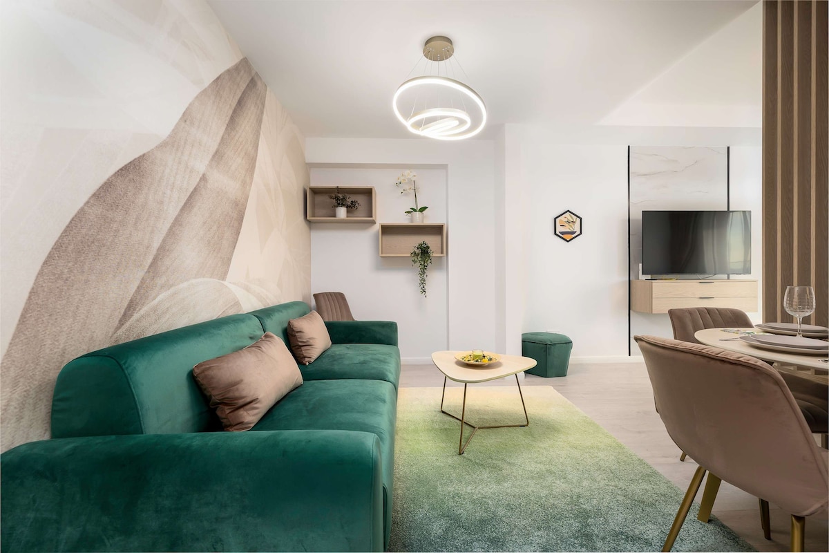 Have fun with the whole family in this stylishing place. Located in a newly developed neighbourhood, on the 2nd floor of a 2024 building block, with a smart detached layout, bedroom with matrimonial bed the space offered a fresh and modern living experience. Multiple shopping options in a walking distance Close to restaurants, recreational facilities, perfect for unwinding. Convenient public transport connections, with bus lines nearby. the poll is close to the apartment,it's called aqua garden