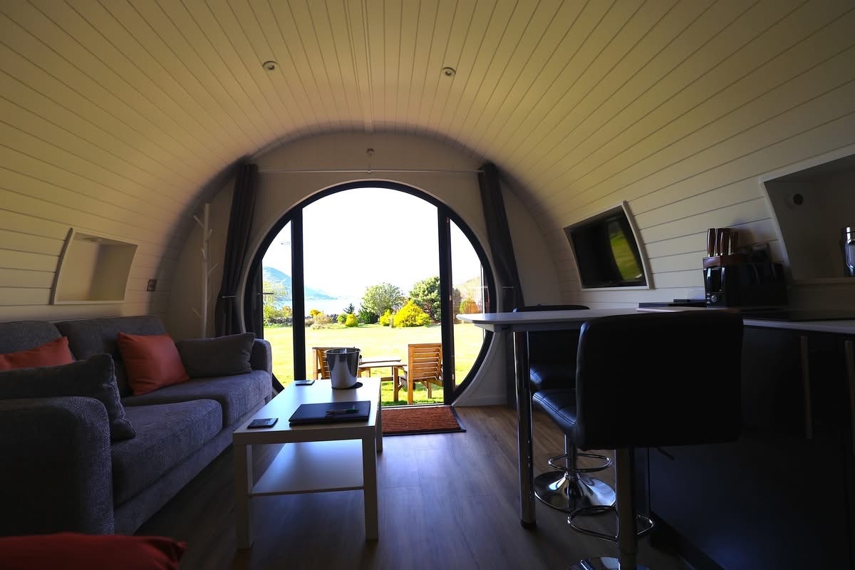 The Red Fox Retreat is the ultimate luxury glamping getaway location. A twist on the more conventional ‘pod’, the cabin features a curved wood interior entered from an arched doorway in front of which is situated a perfectly appointed king sized bed with amazing views of the Trottenish Ridge and the croft (farmland) that surrounds the property. It is warm and cosy to protect against the elements and yet light and airy. The cabin is accessed via a spectacular large undercover deck area.