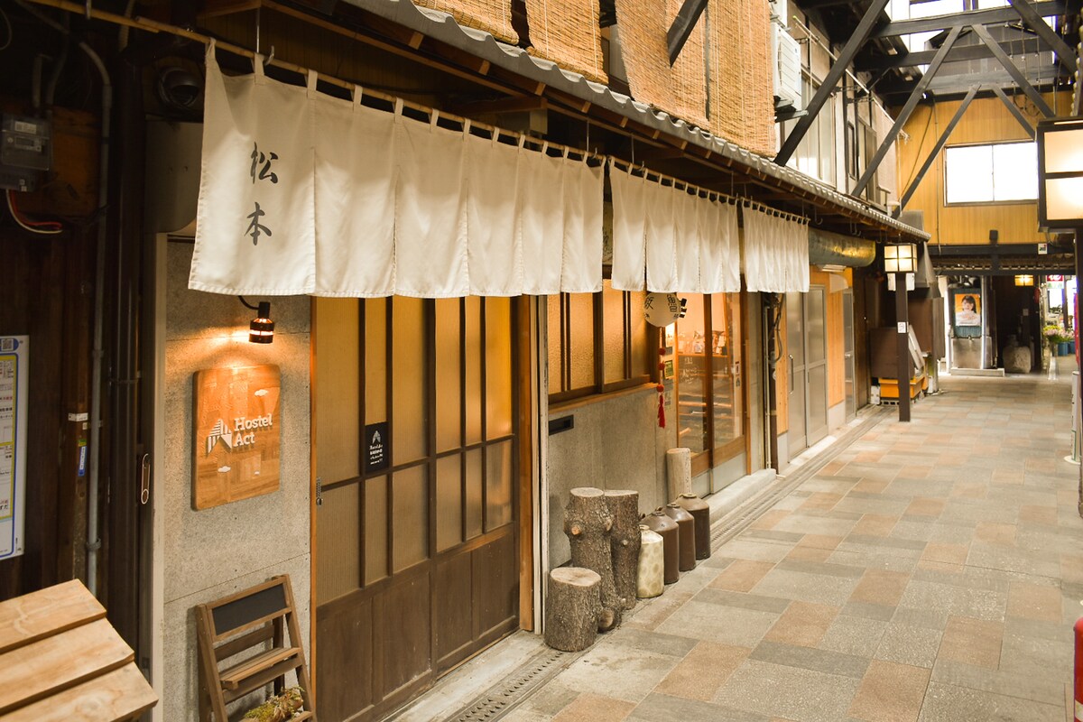 This hostel is a renovated wooden building that is over 110 years old. There is a workspace and shared kitchen where you can work and cook. - 6 minutes by bus number 205 or 7 minutes by taxi from Kyoto station - 4-minute walk from Keihan Kiyomizu-Gojo Station, 15-minute walk from Hankyu Kyoto Kawaramachi Station, 17-minute walk from JR Kyoto Station, 10-minute walk from Gojo Subway Station - Easy access to famous tourist spots: 3 minutes by bus to Kiyomizu-dera Temple area, 7 minutes by train to Fushimi Inari, and 5 minutes by bus to Nishiki Market - 4-minute walk to a convenience store and supermarket - We have turned a 110-year-old historic building into a 10-room hostel - 100 years ago it was used as a playhouse - You can also enjoy interacting with other guests - The walls are thin and it is easy to hear the surrounding sounds, but please enjoy the old-fashioned Japanese building - There is a restaurant on site - Kamogawa is right nearby, so you can relax and enjoy it - The toilet, shower, and sink are shared, but there is a Japanese public bath just a 2-minute walk away that is easy for beginners to enter