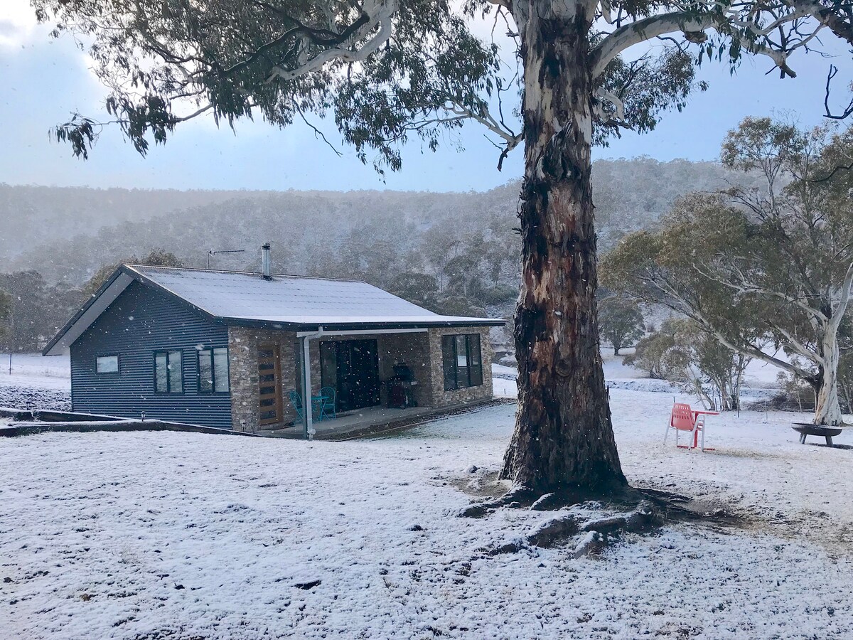 Brand NEW Eco chalet 'The Raven' perched high on the hill with stunning vistas from every window. Only 7km drive to Jindabyne town & 35 mins to snowfields. 50 acres to explore with abundant wildlife, beautiful old Candlebark trees, granite boulders and native grasses. 500m of Mowamba River access where platypus and trout abound. Peaceful and private with glorious sunrises and sunsets. Perfect base for your skiing/ snowboarding, mountain biking, fishing or hiking holiday. Relax, unwind, recharge.