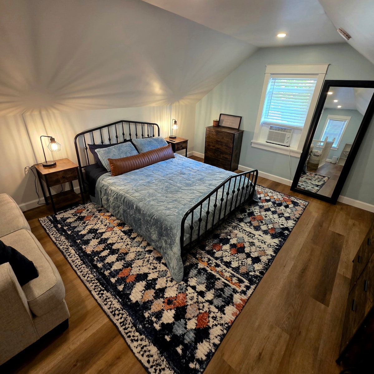 This cozy one-bedroom unit, part of a quiet duplex, offers all the essentials for a relaxed and convenient stay. Located in a charming neighborhood, it’s the perfect spot to unwind while being close to local dining, shopping, and more. Living Area is equipped with a comfortable leather sofa, large chair with ottoman, and a TV for streaming, A fully equipped kitchen, One bedroom with a queen-sized bed and soft linens for a restful night, the bathroom is located right off the bedroom.
