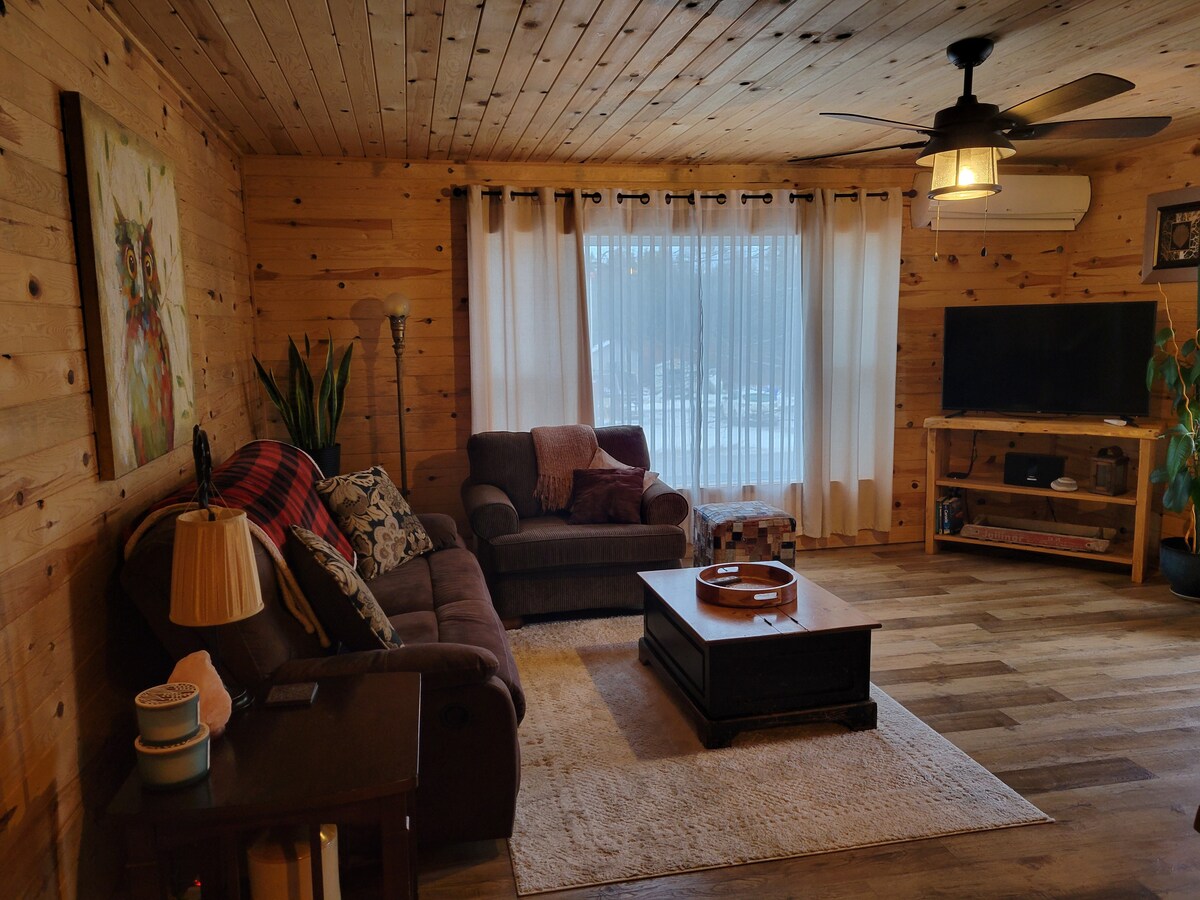 Harbour Cabin sits in a peaceful, leafy clearing just steps from the forest. The building is shared by a wall with Campobello Cabin on the opposite side, but each offers complete privacy with its own entrance and private bathroom. The queen size bed is complimented by a small seating area. The private bathroom includes a bathtub/shower. The room is air conditioned with a smart television and WiFi. There is a small Keurig coffee maker with complimentary coffee pods.