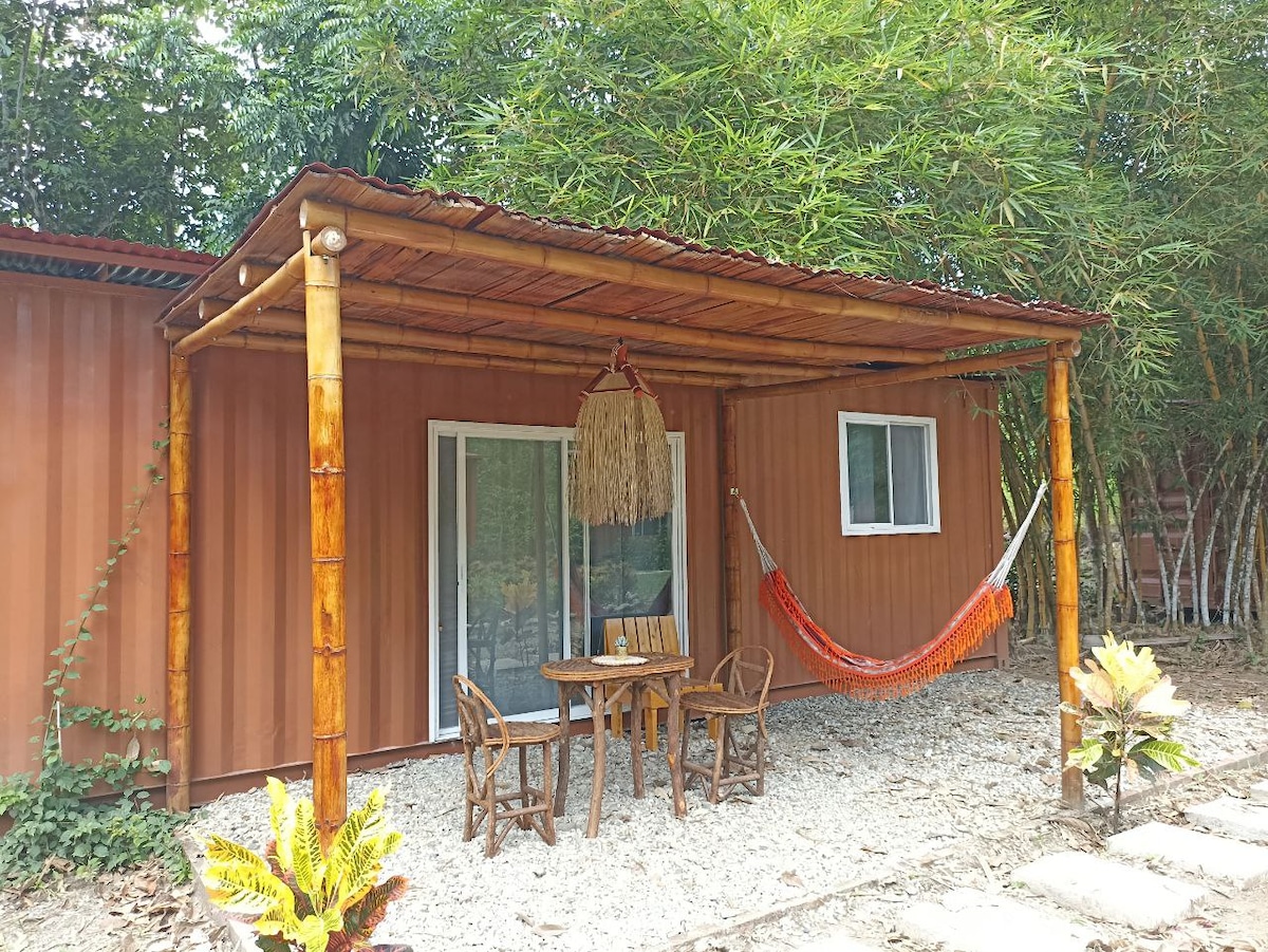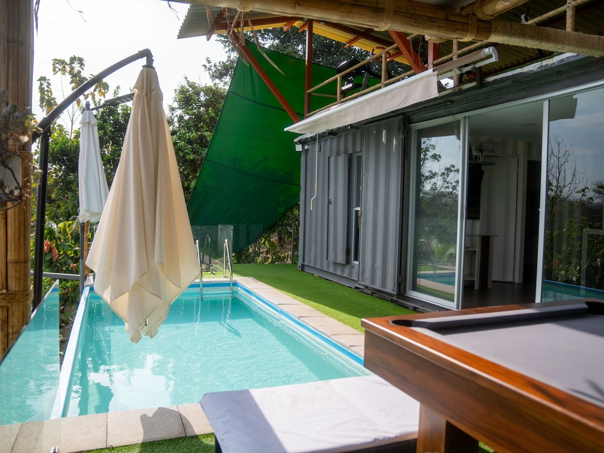 Este acogedor contenedor, adaptado para una estancia cómoda, cuenta con una amplia terraza equipada con mobiliario exterior, hidromasaje privado, ideal para relajarse y disfrutar de las vistas al río Upano.