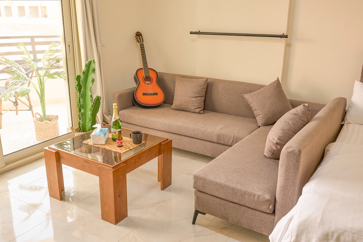 This exquisite apartment features 2 bedrooms with a queen size bed and 2 other single beds. It also features a fully loaded kitchen with washing machine and furnished living room with a large sofa, balcony and a dining table with a coffee corner. Please note that Arab and Egyptian citizens are required to submit proof of marriage before check in. Visitors are not allowed. Please note all guests are required to send passport copies before check in.