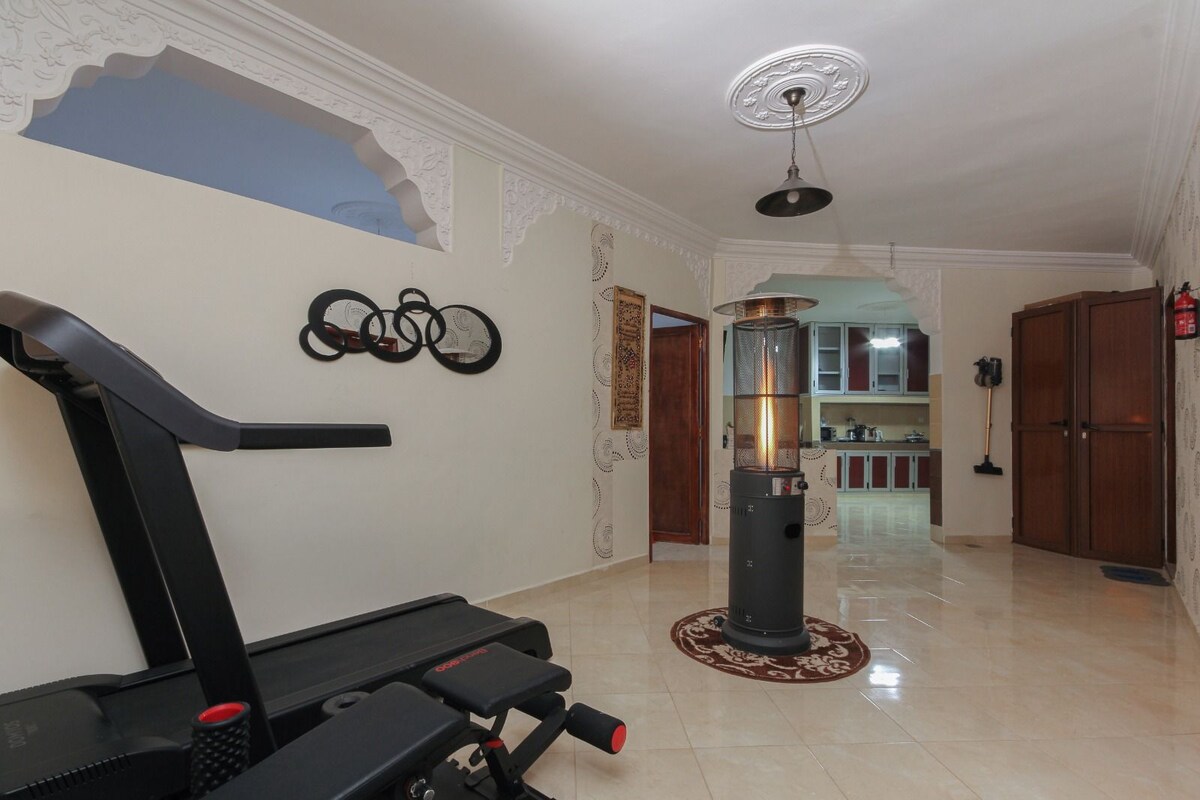 Relax in this quiet and elegant space, beautiful house in the heart of the city el hajeb composed of one (2) bedroom with balcony, a living room, an open and well-equipped kitchen, a hot bathroom, a gym, Wi-Fi, one (3) smart TV, osn+, free Shahid and gas heating, a bed for babies, a desk for your work, a terrace for outdoor dining