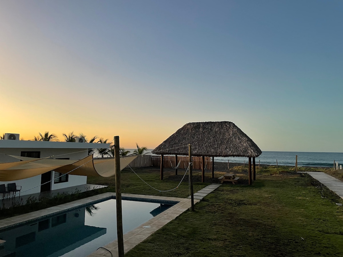 Casa de Playa frente al Mar, completamente privada. La casa cuenta con agua dulce se hizo cisterna para el efecto, y la piscina es de agua salada. Cocina completamente equipada con A/C. Dos habitaciones con A/C y baño privado cada una. Rancho de descanso con hamacas, salida peatonal a la playa, ideal para descansar, acompañado de amigos y familiares, Tranquilo y acogedor. Pensado para la privacidad de nuestros huéspedes. 3 parqueos privados adentro de la propiedad.