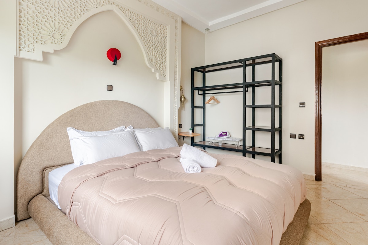 You will love the stylish decor of this charming accommodation. Spacious, modern apartment, with a well-equipped kitchen, 2 bathrooms, overlooking a large artery, panoramic view from a balcony, 180 meters from a Carrefour supermarket, 250 meters from a Turkish BIM supermarket, and 1 km from the train station. Breakfast is served on site. Lunch and dinner are available à la carte in a partner restaurant (traditional and international Moroccan cuisine).