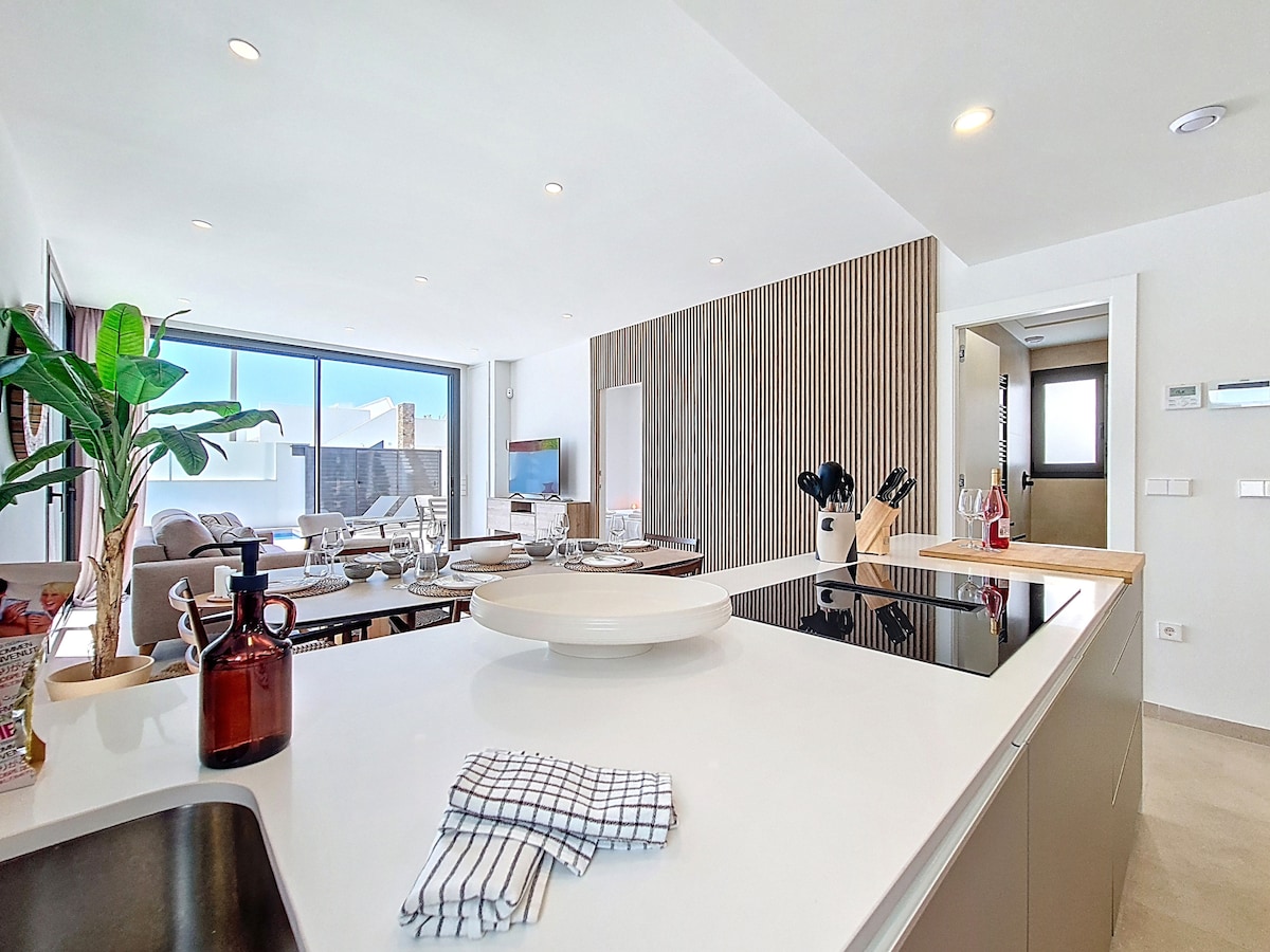 Luxury 6-person holiday villa with heated private pool near the sea. Everything you need for an unforgettable holiday on the Costa Cálida (Spain). 3 stylish bedrooms with double beds. Two luxury bathrooms. Heated private pool (9 meters) with spa and counter-current system. Walking and cycling distance to the beach, promenade, and cozy bars and restaurants