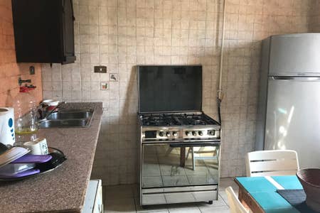 A comfy modern rooftop studio with a private spacious outdoor area that has a basic crossfit gym the studio is a 2 bedroom studio a bedroom that has a king size bed , a big wardrobe, dressing table and a studying desk the bedrooms has its own private bathroom and a living room with an American kitchen also has a wide comfy couch for guests to use as an extra space for sleeping can accommodate 2 guests easily the studio is air-conditioned and has a WiFi free access has all cooking utilities