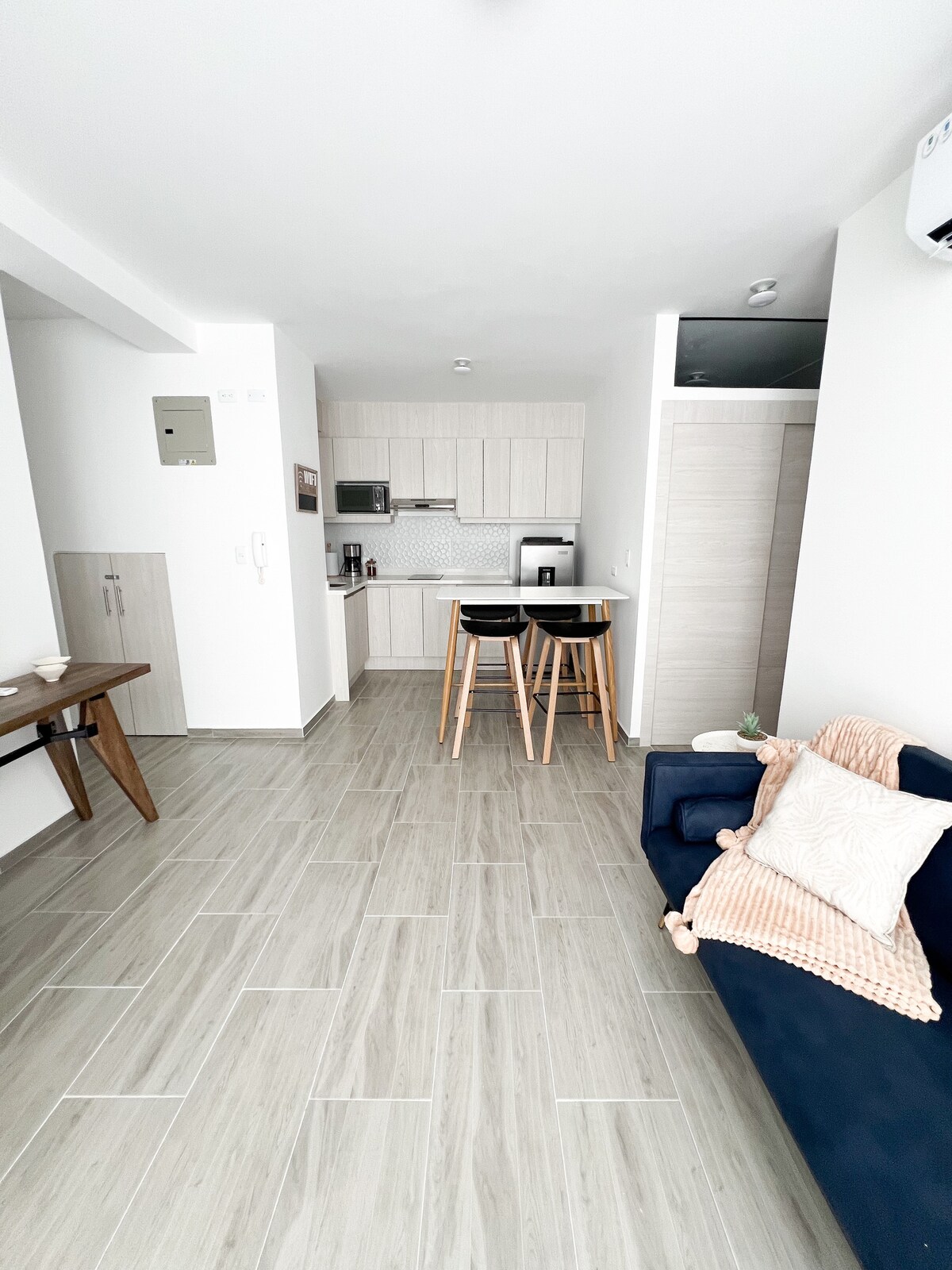 Modern apartment with ocean views, steps from El Murciélago Beach (venue for Ironman 70.3), Mall del Pacífico, and top local restaurants. Perfect for vacation/remote work with a monitor provided. Quiet, away from street noise. 24/7 security and high-speed fiber optic internet. Amenities include a pool, sauna, and jacuzzi (open Tue-Sun, it may change without notice). The building has a generator for common areas, and a UPS keeps the WiFi running. Elevator, water, and internet work during outages.