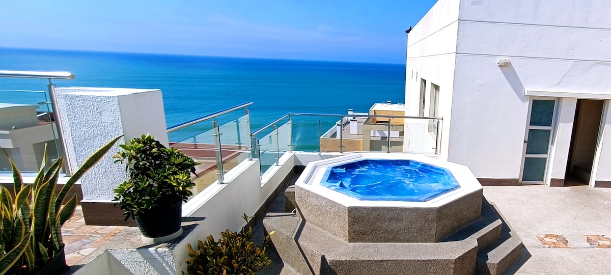 Want an apartment with an amazing view of the ocean? This is the ideal space... It has a spectacular ocean view, the place is very comfortable, and has a swimming pool and exit to Murciélago beach (public beach). It is strategically located, close to shops and restaurants, a few steps from the Pacific Mall. The building has 11 floors and the apartment is on the 9th floor, which you access by elevator. It has two bedrooms with beds for 3 people and 2 and a half people.