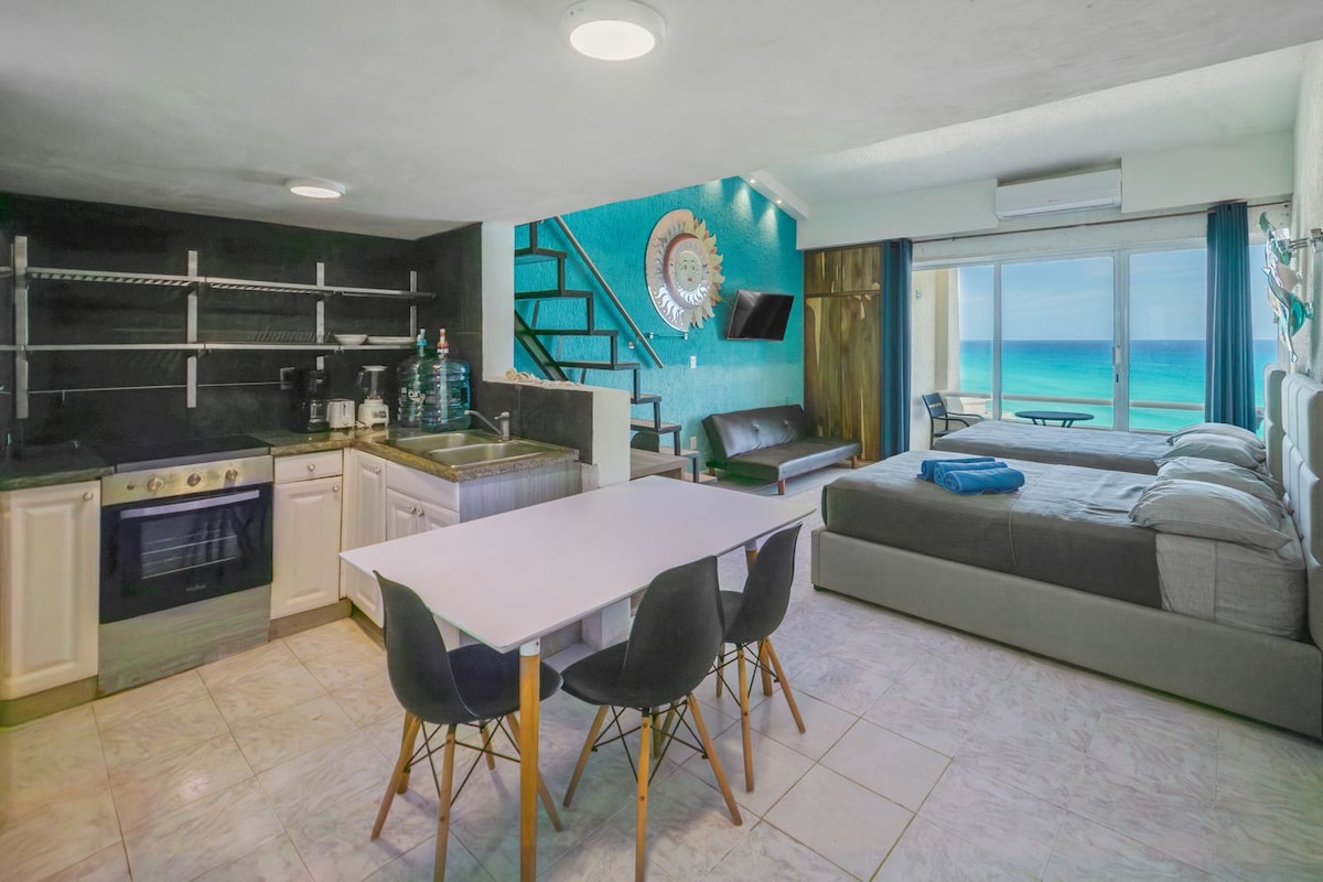 Two full beds studio with spectacular views. Direct access to our private beach. We share facilities with a boutique hotel so you have free access to the amenities like pools, beach, chairs, cabanas, jacuzzi, gym, tennis court. Optional daily all inclusive wristband- purchase is at front desk- through the hotel (today $95 usd p/p per day). Coffee shop at lobby, restaurants (a la carte) and convenience store across the street. High speed wifi. 15 minutes from the airport.