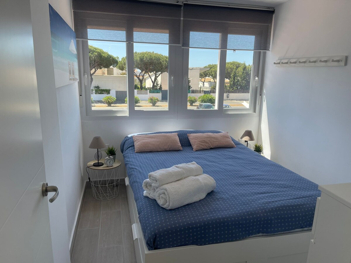 Cozy apartment, nice, clean and well-kept. Development with 2 pools and 4 paddle tennis courts. With a garage space and Wi-Fi. Exactly 1350 meters from the beach. It's a 15-20 minute walk or 3 minutes by car. In summer you can park near the beach for €1/24 hours. Double bed (135x190) and 2 single beds (90x190 and 80x180), bathroom, kitchen with ceramic hob, microwave, normal and single-dose coffee maker, washing machine, kitchen utensils…TV Aire acondicionado. Sheets and towels. Blankets. Terrace