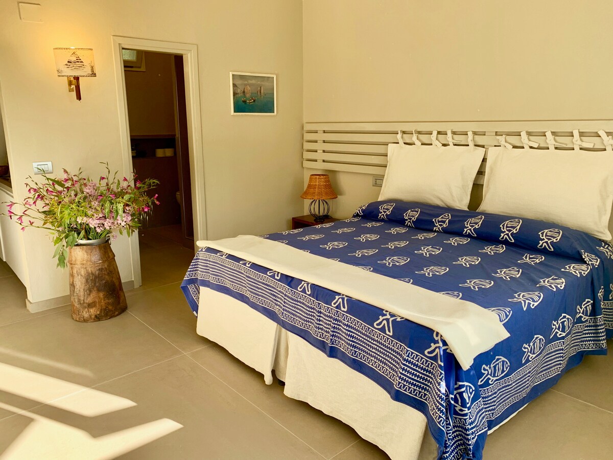Romantico e autentico , l'appartamento Capraia rispecchia la natura dell'isola omonima, circondato da un giardino rigoglioso di piante grasse e ulivi , gode di una splendida vista sul golfo di Lacona . Appartamento si compone di un ampio terrazzo esterno attrezzato con tavolo sedie e lettini , barbeque e doccia esterna, una piccola cucina con vista, una camera matrimoniale e un bagno con doccia.