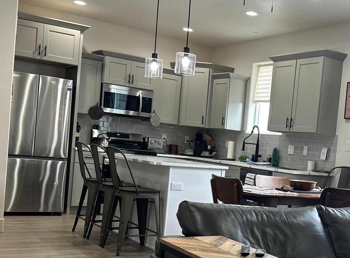 New flooring and carpet throughout!! Escape to our peaceful family retreat. Nestled in a quiet neighborhood with nearby shopping and dining. Unwind in the master bathroom's large jetted tub. Main floor boasts 3 bedrooms with a total of 4 beds, a cozy living room with a Samsung Frame TV, and upstairs, a kids' haven with games, toys, TV, and Nugget Couches. We provide coffee and cocoa pods for a Keurig coffee machine. We do also have a coffee pot if you wish to bring your own coffee.
