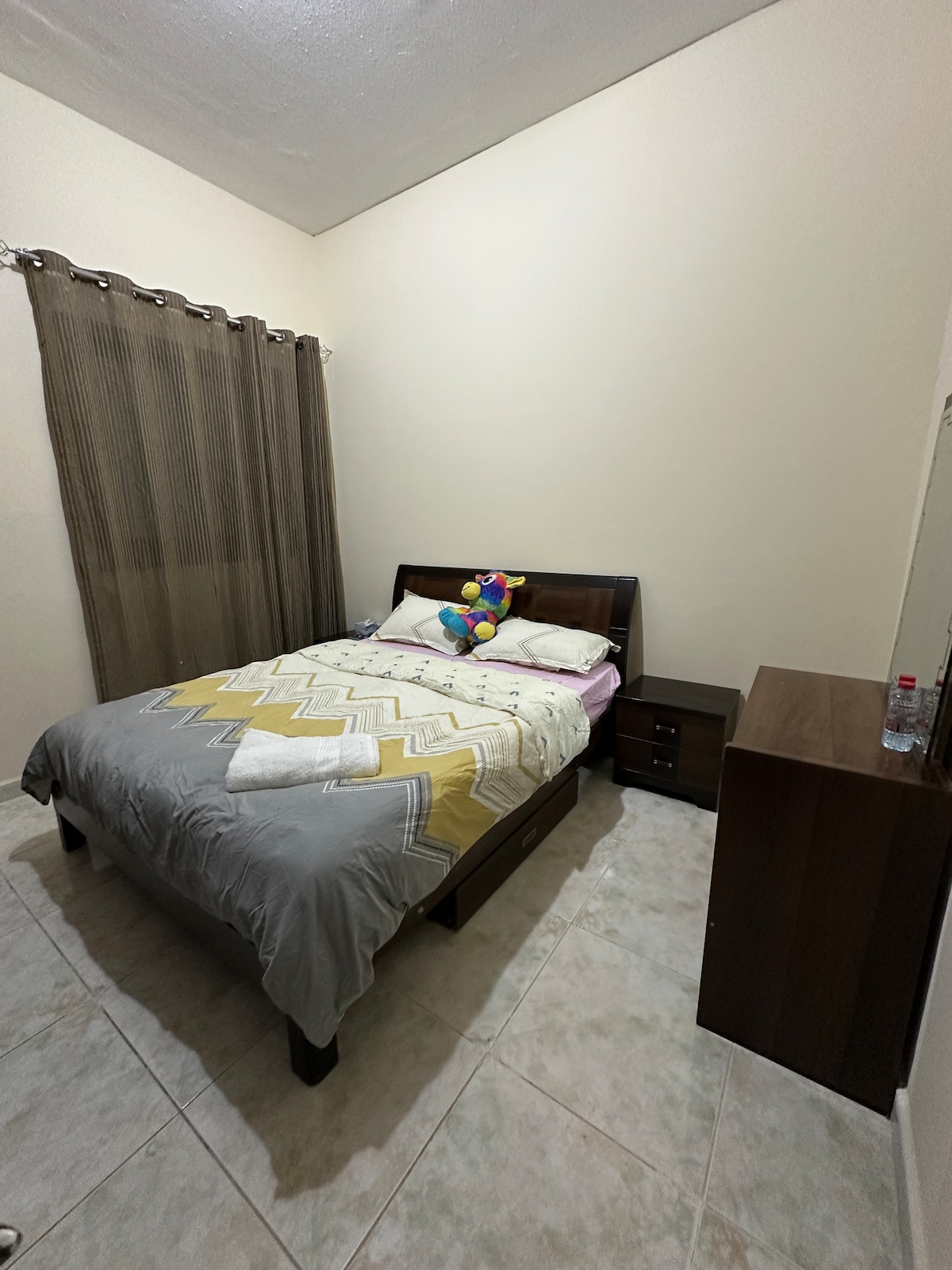 Close to everything just type in ALAMEERA Ajman and you will see that the location has easy access to anything . Recently decorated , nice and clean 1 st floor free parking very clean . Kitchen AC toilet Sofa huge bed etc