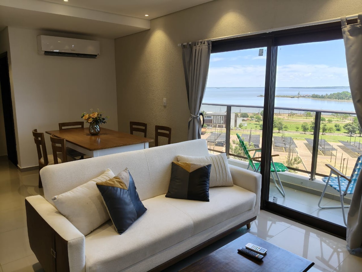 Apartamento con balcón vistas al río y excelente ubicación!📍. A pocos pasos de la Costanera, Playa San José🏖️, restaurantes🍴 y de Shopping Costanera 🛍️. Habitación principal con cama matrimonial 🛏️, sala con sofá cama(2.10 x 0.95 x 0.92) 🛋️, comedor, cocina integrada y baño moderno 🚿 Seguridad 24/7 🔒 y servicio de lavandería dentro del edificio para tu comodidad. Aires Splits en habitación y sala-comedor.