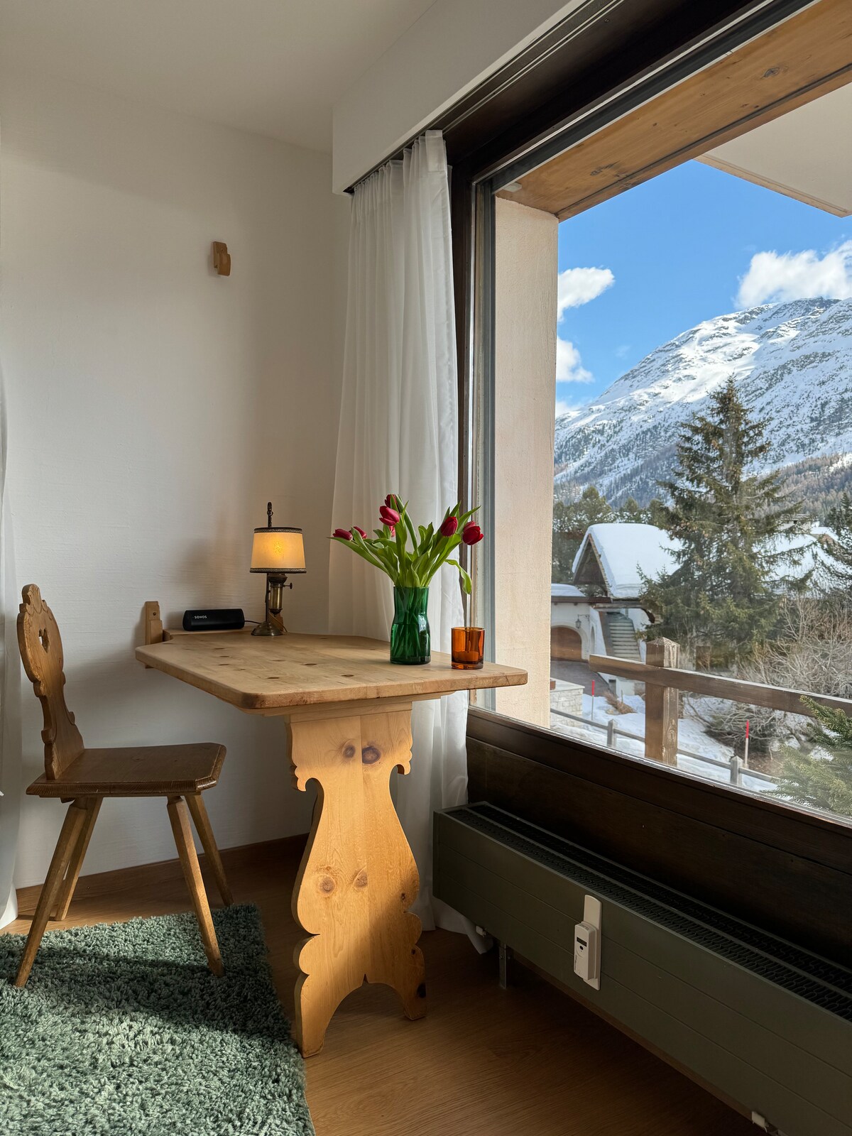 No Wi-Fi in the quiet penthouse, but a large window front with unique views of the mountains of the Upper Engadine. The house (Chesa) Prünella is located on the sunny Albula slope, about 15 km from St. Moritz. The apartment is very cozy, comfortable and well maintained! Free, fast internet in and around the parish house in Chamues-ch.